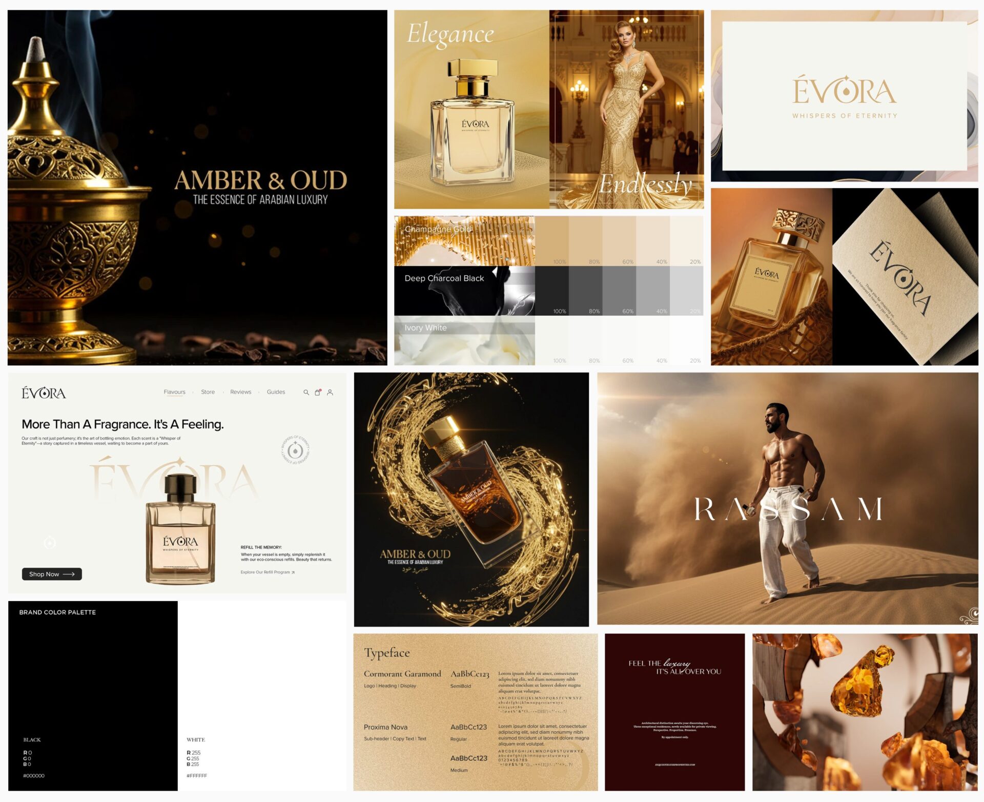 Moodboard exploring luxury tones, soft lighting, and elegant serif typography.